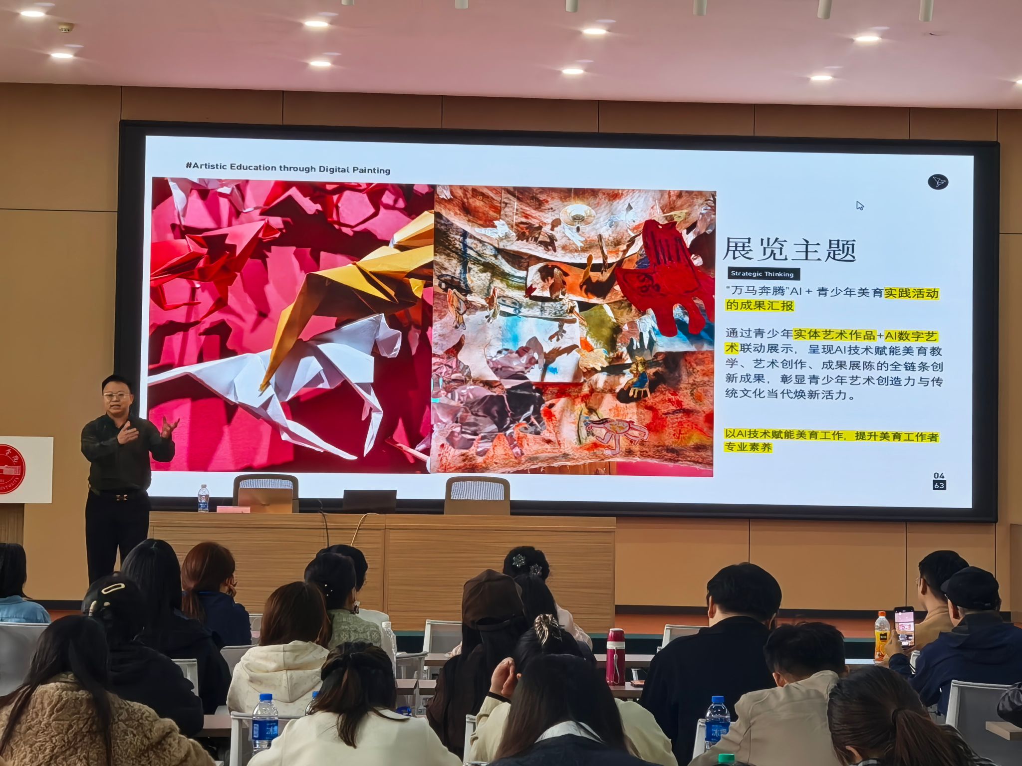 人居环境与数字设计研究院经理姚金贵教授以《AI赋能美育:理念与实践》为题,开启培训第一讲。他从展陈设计视角,阐述了AI技术如何提升美育的互动性与沉浸感。