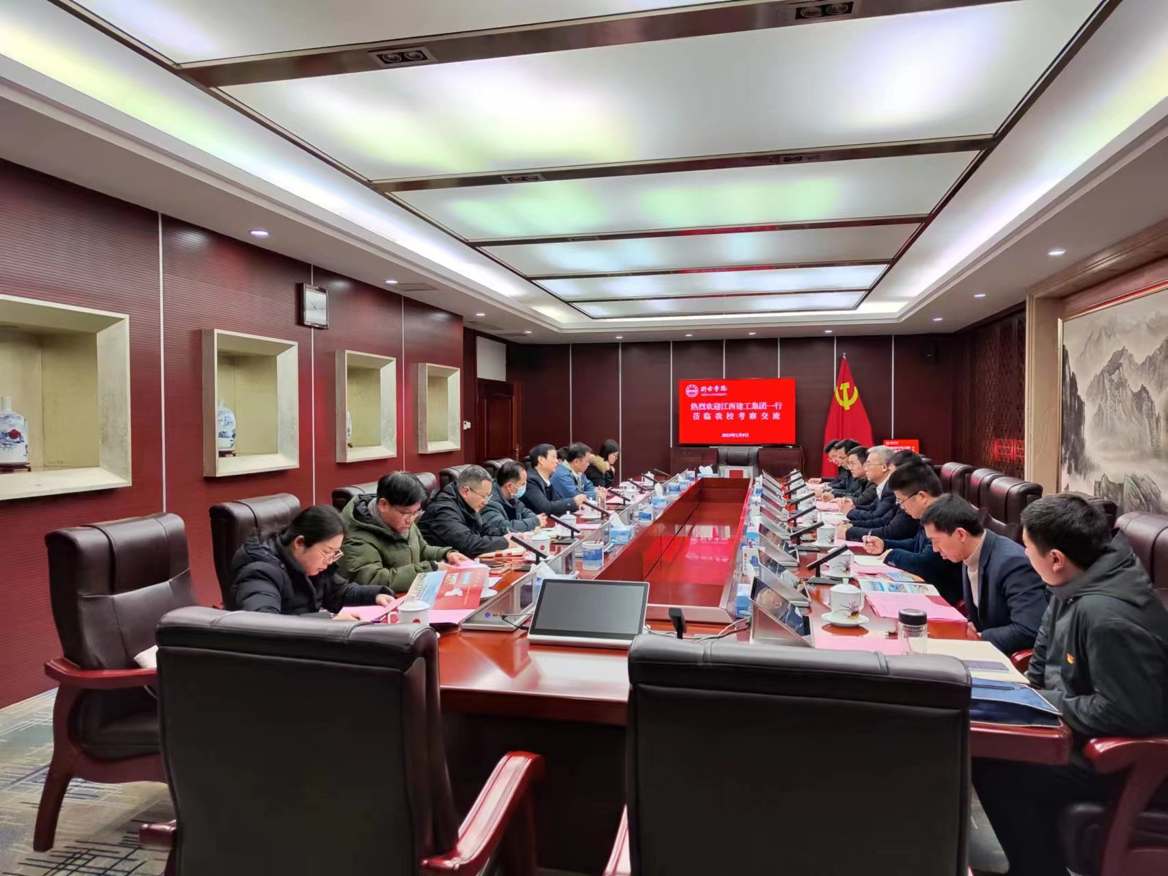 2月9日上午,江西省建工集团监事会主席熊业钊一行来公司考察交流,董事长张玉清在行政楼三楼会议室热情接待来宾。公司党委委员、副董事长李敏出席会议,相关部门、二级学院负责人参加会议。