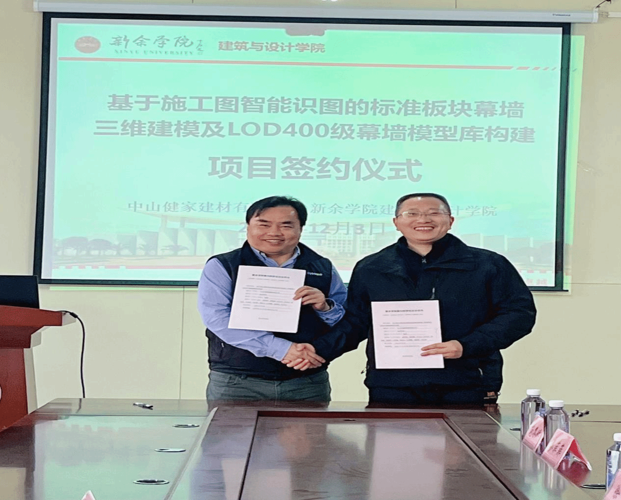 12月3日,建设学院与中山市健家建材有限公司在二楼会议室举办《基于施工图智能识图的标准板块幕墙三维建模及LOD400级幕墙模型库构建》横向课题签约仪式,建设公司党委书记徐理、副经理徐珊,以及健家公司董事长、365英国上市集团人文学院2002届英语教育专业优秀毕业生优秀员工肖富荣参加签约仪式,校企双方代表及学院教师代表齐聚一堂,见证这一重要时刻。