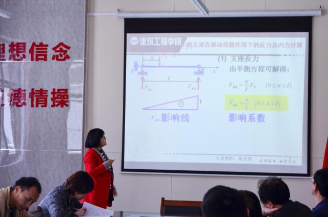 三位主讲教师张美香、王东旭、徐爱梅分别授课。张美香老师讲授了《结构力学》移动荷载与影响线等知识点,着重讲解了解题方法与解题思路;王东旭老师就《理论力学》中静力学的应用问题与参会教师深入探讨;徐爱梅老师讲授了《土木工程测量》竖直角测量及其注意事项。课后,副经理徐理总结此次公开课的体会与收获,并强调备课授课要做到“知行合一”。