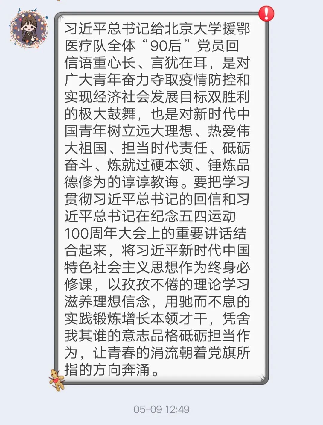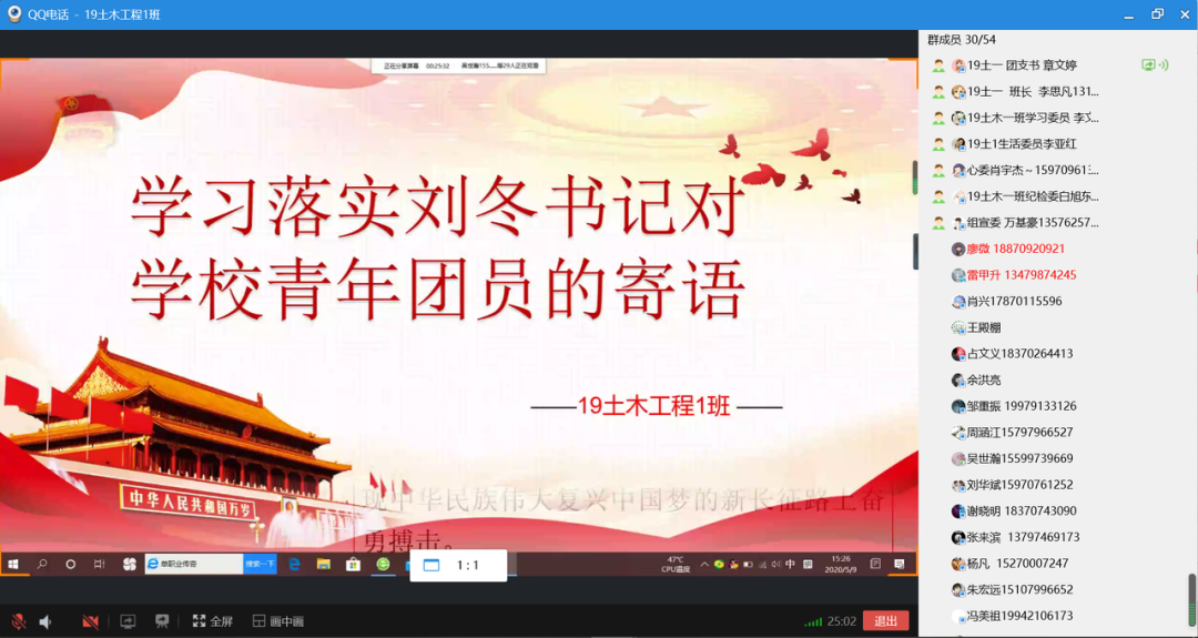 19土木工程1班团支部成员重温了习近平总书记给北京大学援鄂医疗队全体“90后”党员的回信,并分享了学习习近平总书记对青年的寄语及公司党委刘冬书记对学校团员青年的寄语的感悟。