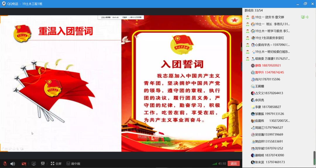 团支书带领大家一起重温了入团誓词。团员们高举右手,紧握右拳,再次郑重地宣誓,宣誓铿锵有力,慷慨激昂。团员们举起的右手紧握的是共青团员的忠诚,专注的目光凝聚着共青团员的坚定。屏幕里神圣庄严的入团誓词,仿佛又让在场的全体共青团员回到了入团时那令人激动而又难忘的时刻。再次宣誓,也让全体团员为共产主义事业奋斗的信仰进一步得到升华。