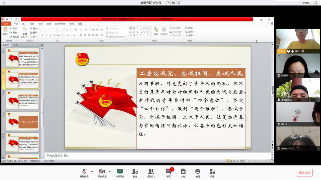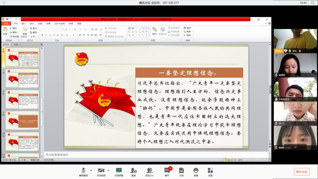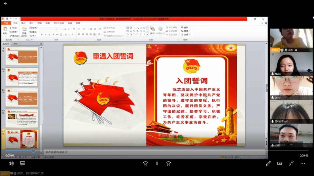 最后团支部副书记刘星星带领全班重温入团誓词,并做出总结,青春像盛开的花,是人生的黄金时期,这个时期的我们是朝气的,是蓬勃的,也应该是创造的,是奋斗的。