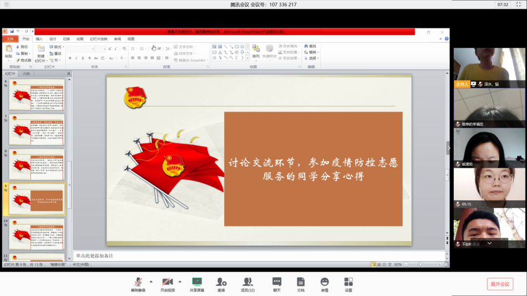 随后由参加了疫情防控志愿服务的孔令苪同学发言,以自身抗疫经历结合视频内容,将活动气氛推向高潮。磨难压不倒,奋起正当时。生死考验面前,总有身影逆行而上,总有团旗高高飘扬。尽管形势严峻,奋战在一线的青年英勇无畏的身姿,点燃了人们心中的希望。他们时刻准备着,响应号召,应战疫情,为打赢疫情防控阻击战贡献一份力量,在危难之时挺身而出,在需要之时无私奉献,绽放青春之花。